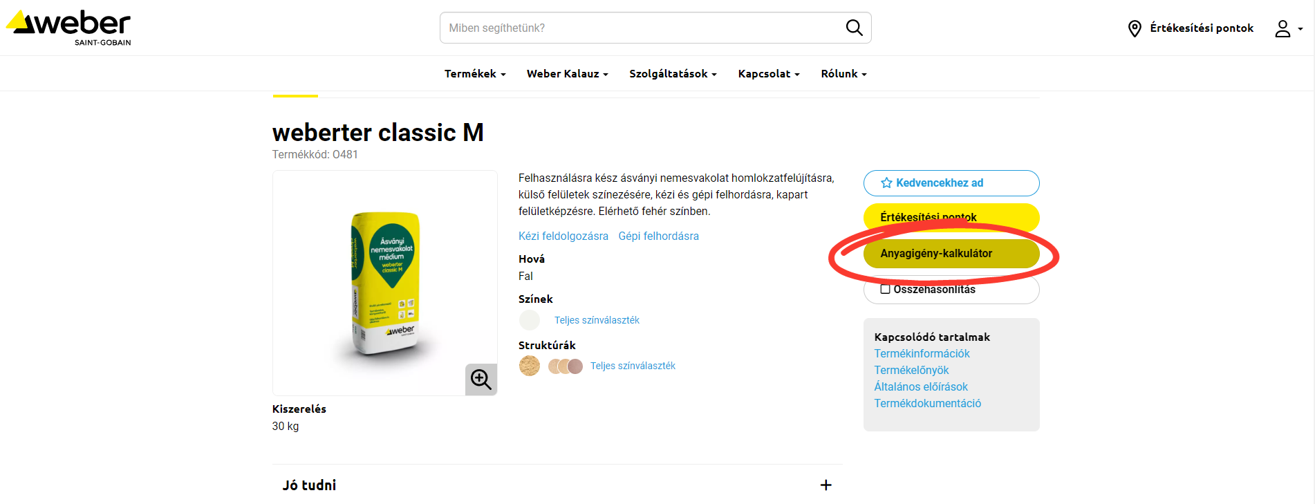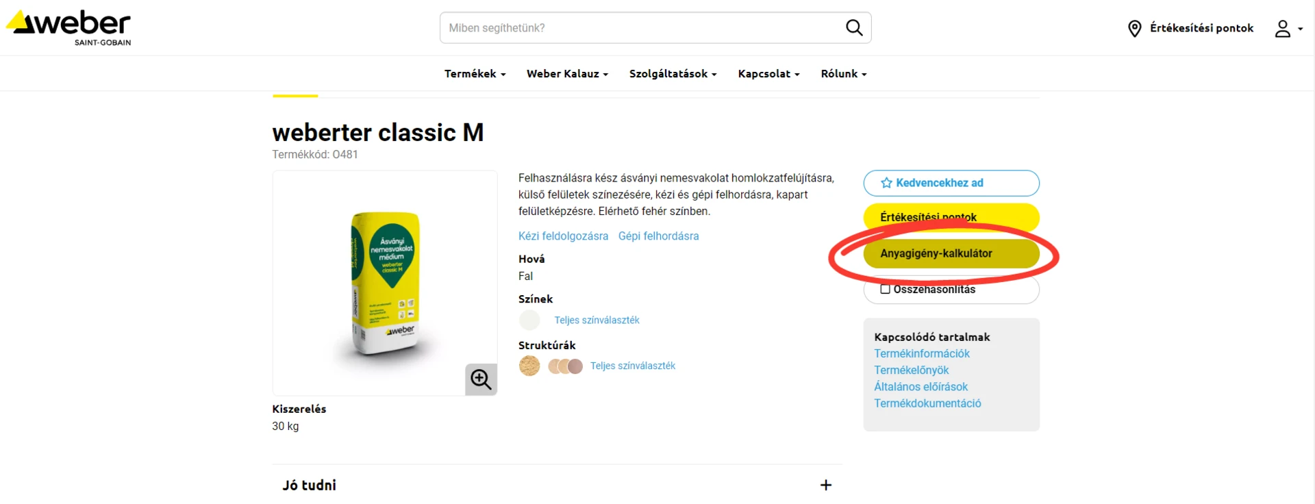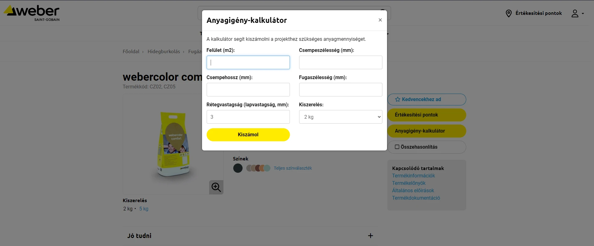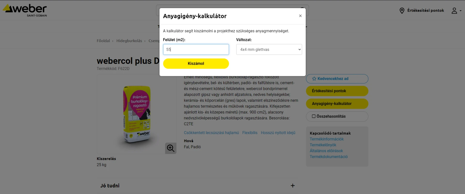 Termékoldalainkon a felhasználási útmutató mellett, jobb oldalon jelenik meg a kalkulátor. A Felület (m2) mezőbe írja be a kívánt alapfelület nagyságát négyzetméterben, majd a rendszer megjeleníti a szükséges teljes anyagmennyiséget, amit felkerekít az adott termék kiszerelési egységének megfelelően egész zsákra, vödörre, vagy egyéb egységre. Ezzel megkapja a végeredményt.