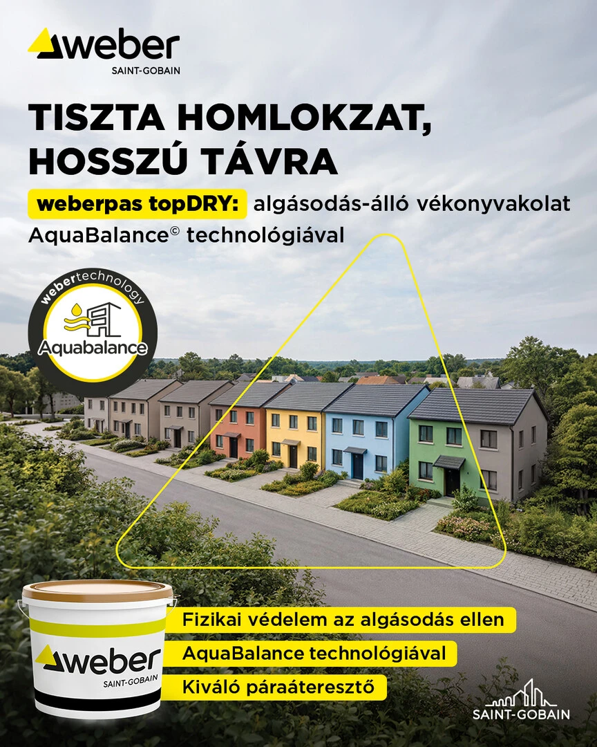 A Weber fejlesztései, a weber topDRY hőszigetelő rendszer pontosan erre kínál megoldást: egyszerre biztosít kiemelkedő hőszigetelést és hosszú távon szép, algásodásnak ellenálló homlokzatot. Ez a kettős előny teszi különlegessé, és ezért érdemes most komolyan fontolóra venni azoknak, akik házuk szigetelésén gondolkodnak.